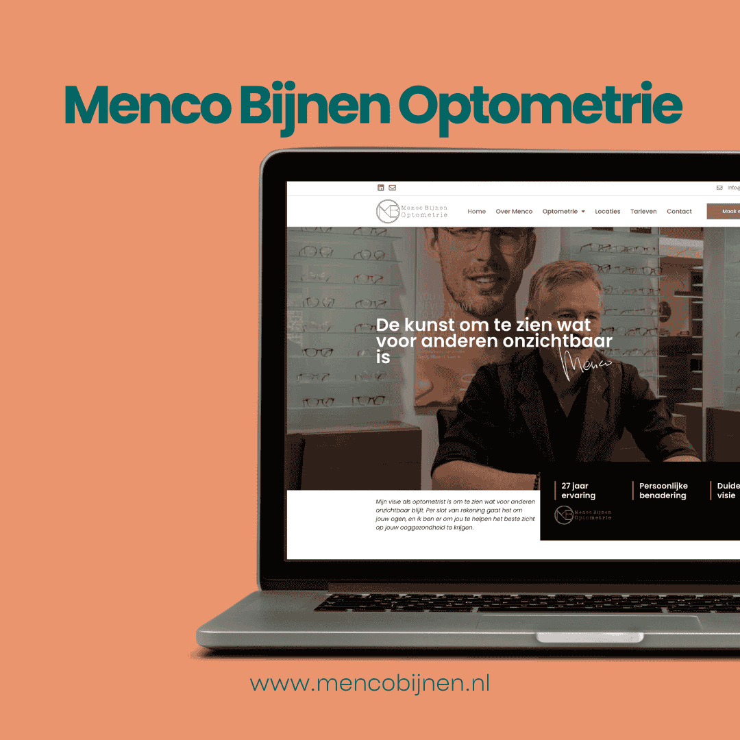 Dat is toch wel een hele mooie welkomstboodschap die Menco de wereld inslingert. Het geeft exact weer wat zijn professie is. ‘Mijn visie als optometrist is om te zien wat voor anderen onzichtbaar blijft. Per slot van rekening gaat het om jouw ogen, en ik ben er om jou te helpen het beste zicht op jouw ooggezondheid te krijgen’ aldus Menco Bijnen. Belangrijk is dat dit ook goed tot uitdrukking komt in de website. Daarom ging we aan de slag met een nieuwe website en bijpassende, originele fotografie.
